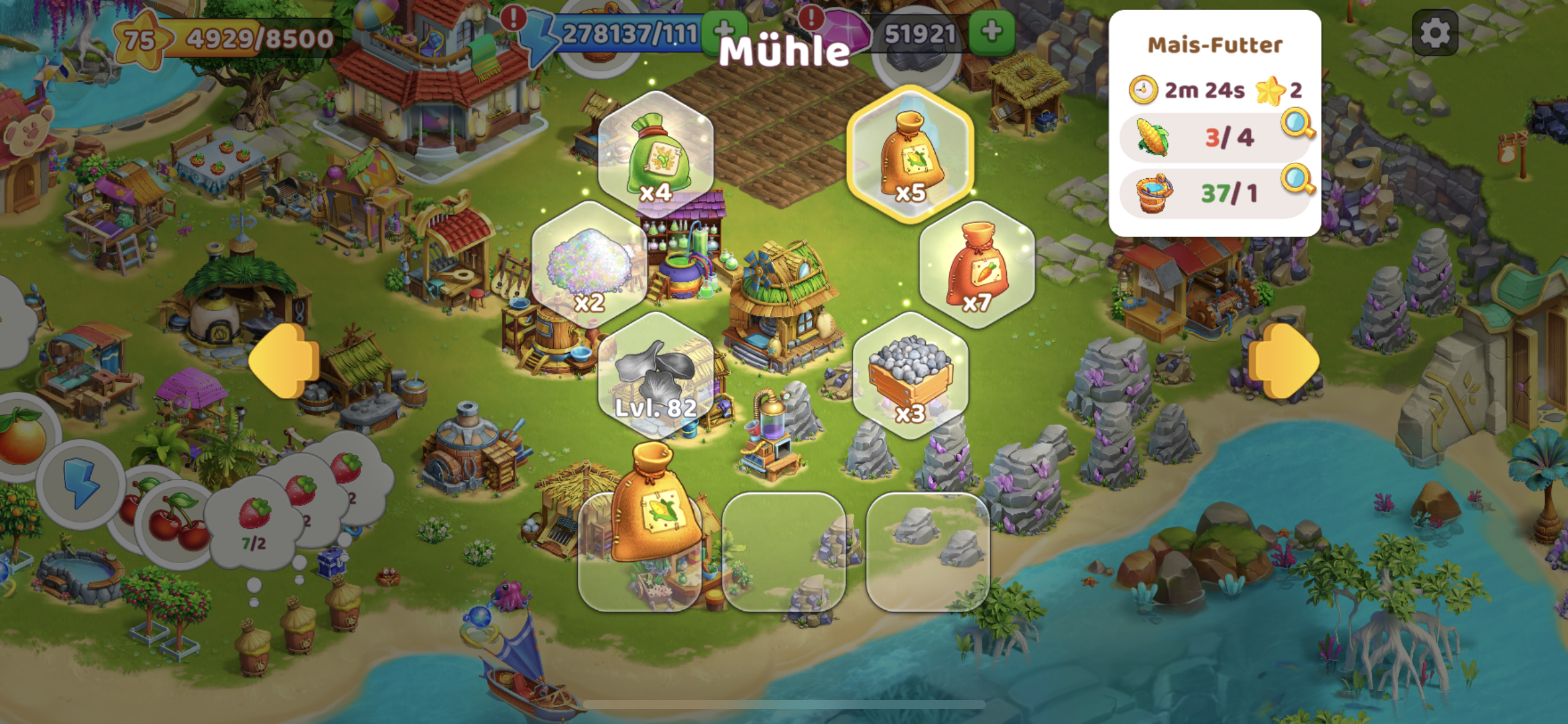 Um dein Vieh zu füttern, musst du Futter für es herstellen. Dazu öffnest du das Menü Mühle, wählst das gewünschte Futter und startest die Produktion, indem du das Symbol in ein leeres Feld am unteren Bildschirmrand ziehst. Wenn das Futter fertig ist, kannst du ein Tier füttern, indem du es antippst. Im Gegenzug gibt dir das Tier etwas, das es produziert.