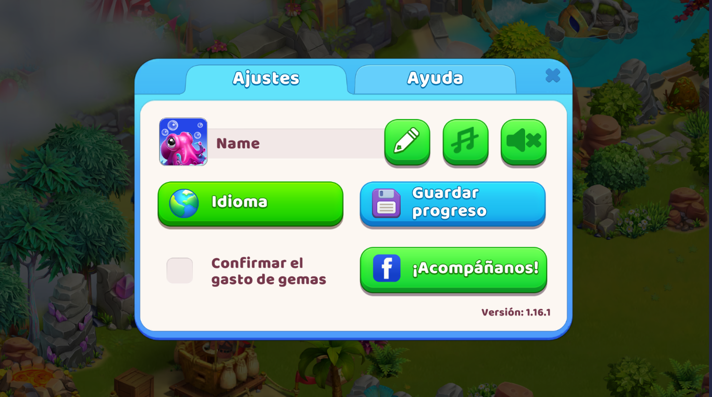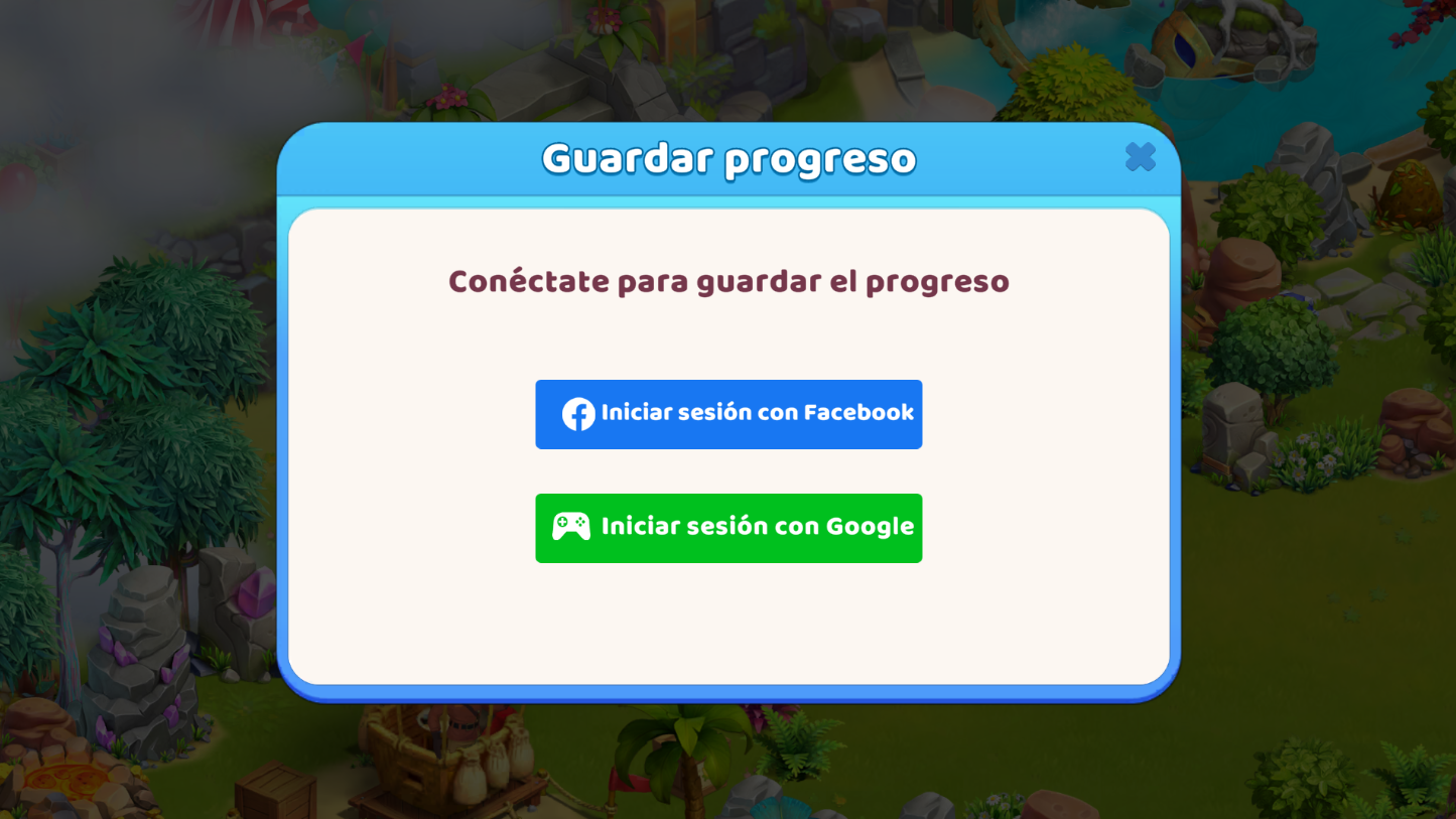 Hay varias formas de guardar tu progreso en el juego: usando Facebook, Google Play o el ID de Apple. Puedes ver las opciones disponibles en el menú del juego. Toca el botón que hay en la esquina superior derecha de la pantalla y pulsa el botón Guardar progreso del menú. Después se abrirá una ventana con las opciones de guardado.