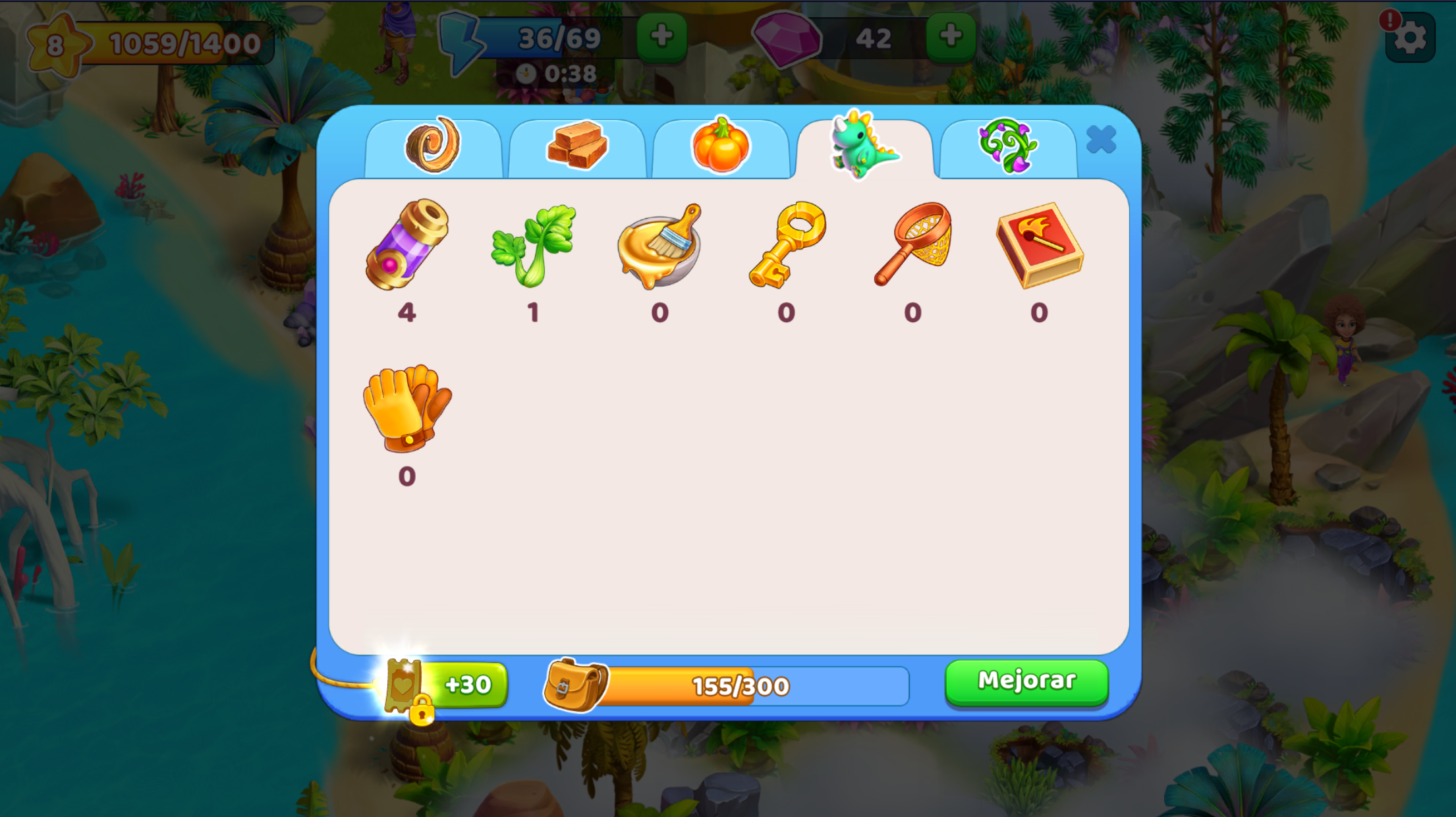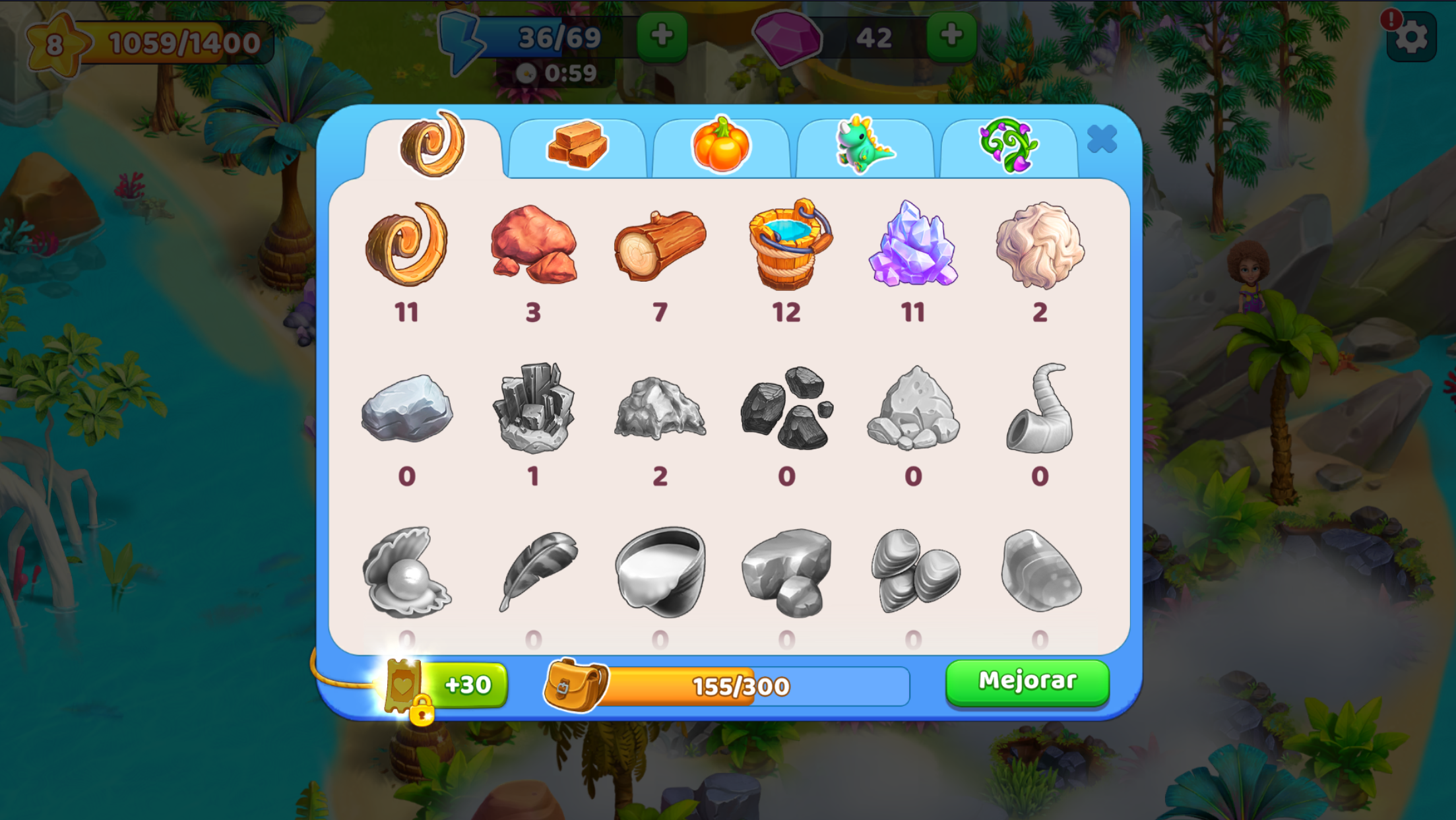 El almacén tiene distintas secciones: una sección con recursos, objetos de producción, productos orgánicos y cultivos maduros, además de una sección con objetos de ubicaciones permanentes (la pestaña con el dinosaurio ). Estos últimos no ocupan espacio del almacén.