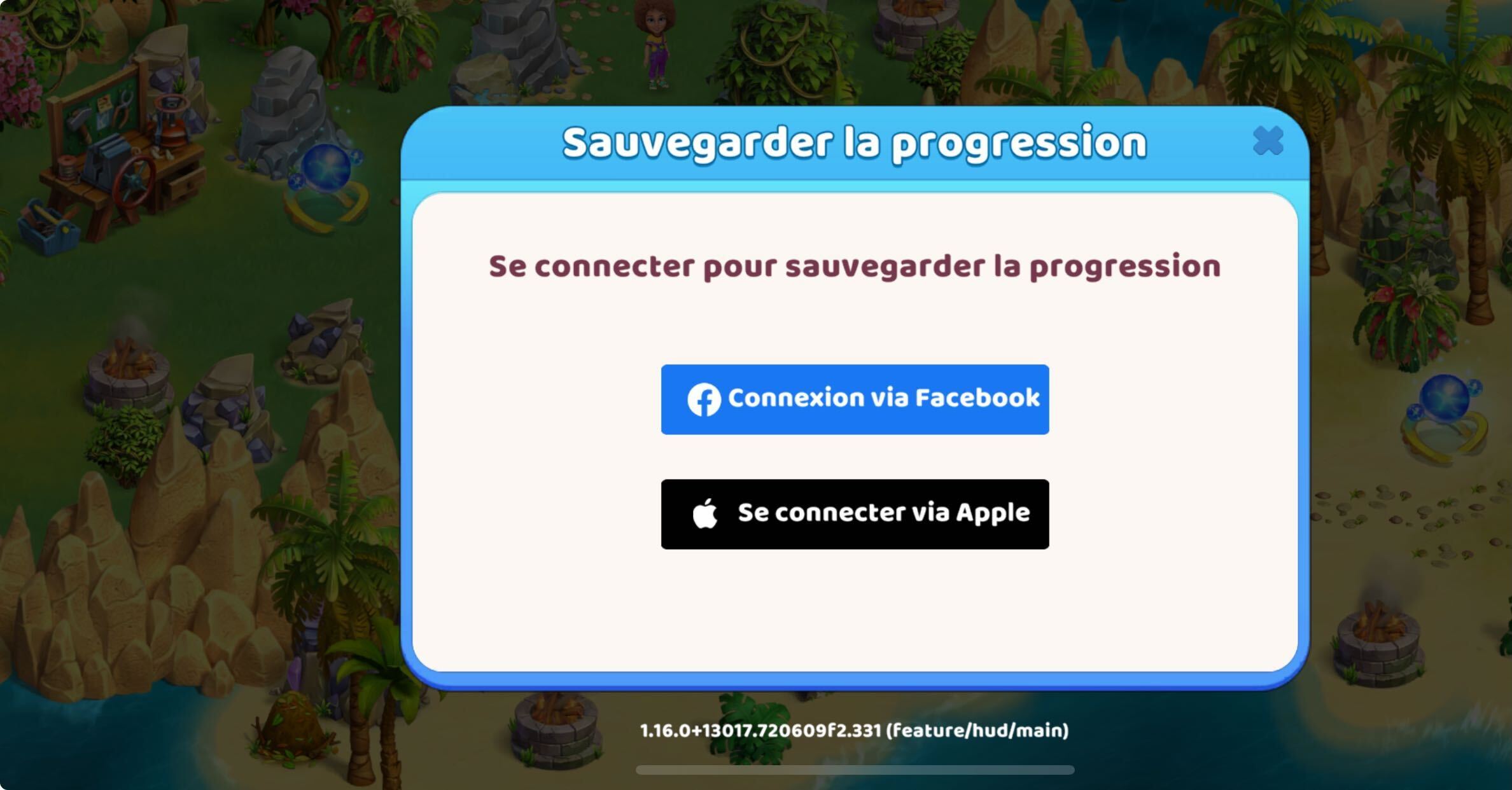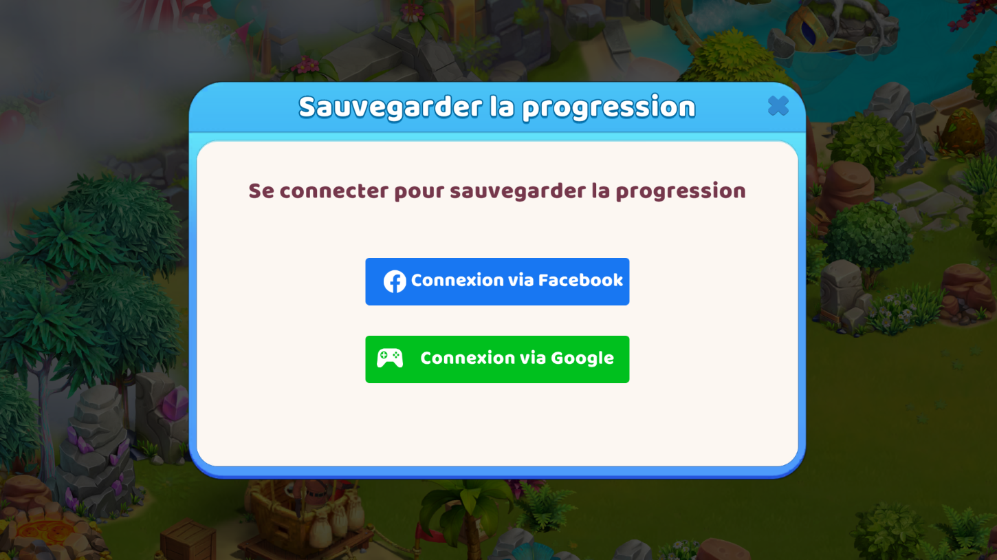 Il existe plusieurs façons de sauvegarder ta progression dans le jeu, en utilisant Facebook/Google Play/identifiant Apple. Tu peux voir les options disponibles dans le menu du jeu. Appuie sur le bouton dans le coin en haut à droite de l'écran, puis appuie sur le bouton « Sauvegarder la progression » dans le menu. Cela ouvre une fenêtre avec les options de sauvegarde.