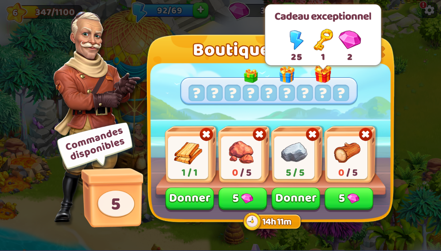 Le négociant Gaspar commence à venir sur l'Île de la maison une fois que tu as atteint le cinquième niveau et terminé les quêtes actives affichées sur le côté gauche de l'écran. Sa montgolfière se pose sur un site spécial dans la partie ouest de l'Île de la maison. En exécutant ses commandes, tu obtiens des ressources, de l'énergie et, pour la troisième étape des commandes, des gemmes et des clés pour ouvrir des coffres.