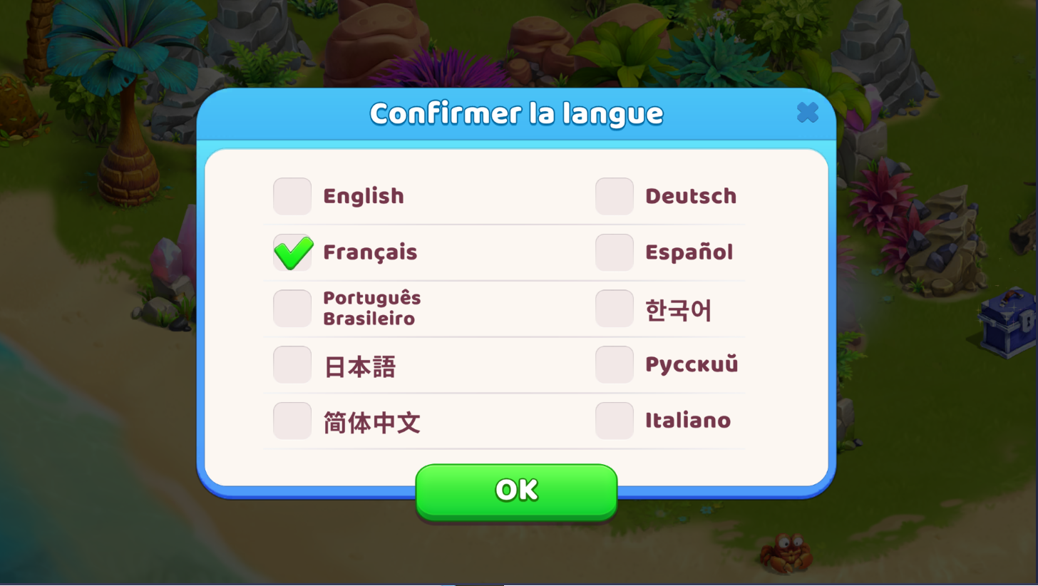 - Dans la fenêtre qui s'ouvre, choisis ta langue dans la liste des langues prises en charge. Le jeu se chargera automatiquement dans la langue sélectionnée.