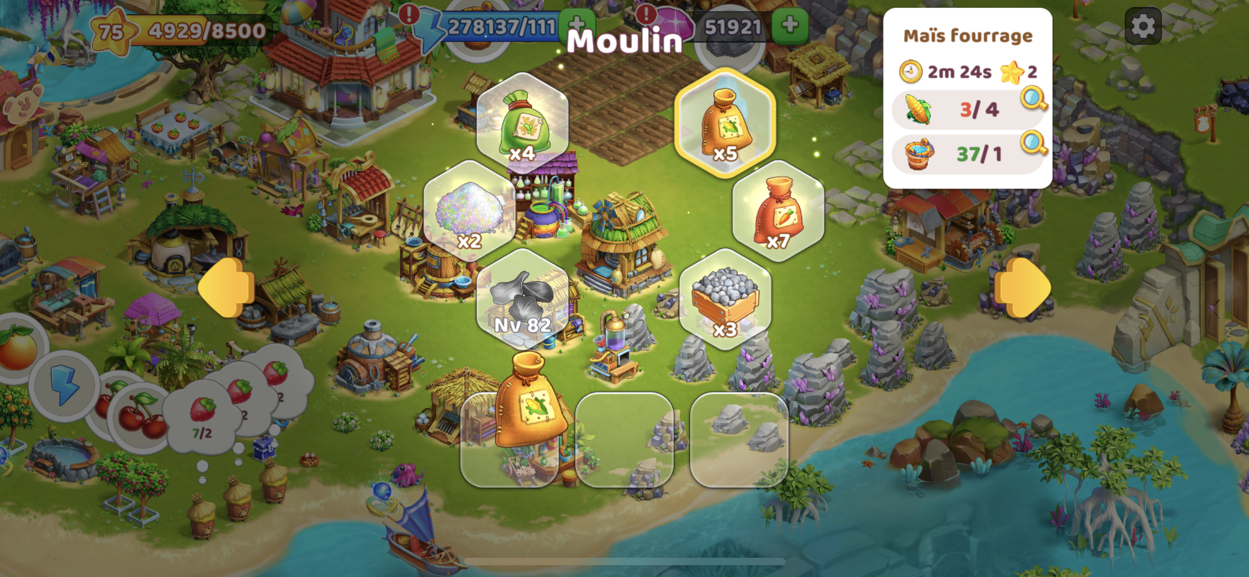 Pour nourrir ton bétail, il faut fabriquer de la nourriture. Pour ce faire, ouvre le menu Moulin, choisis l'aliment requis et lance la production en faisant glisser l'icône de cet aliment vers une case vide en bas de l'écran. Lorsque la nourriture est prête, appuie sur un animal pour la lui donner à manger. En échange, l'animal te donnera quelque chose qu'il produit.