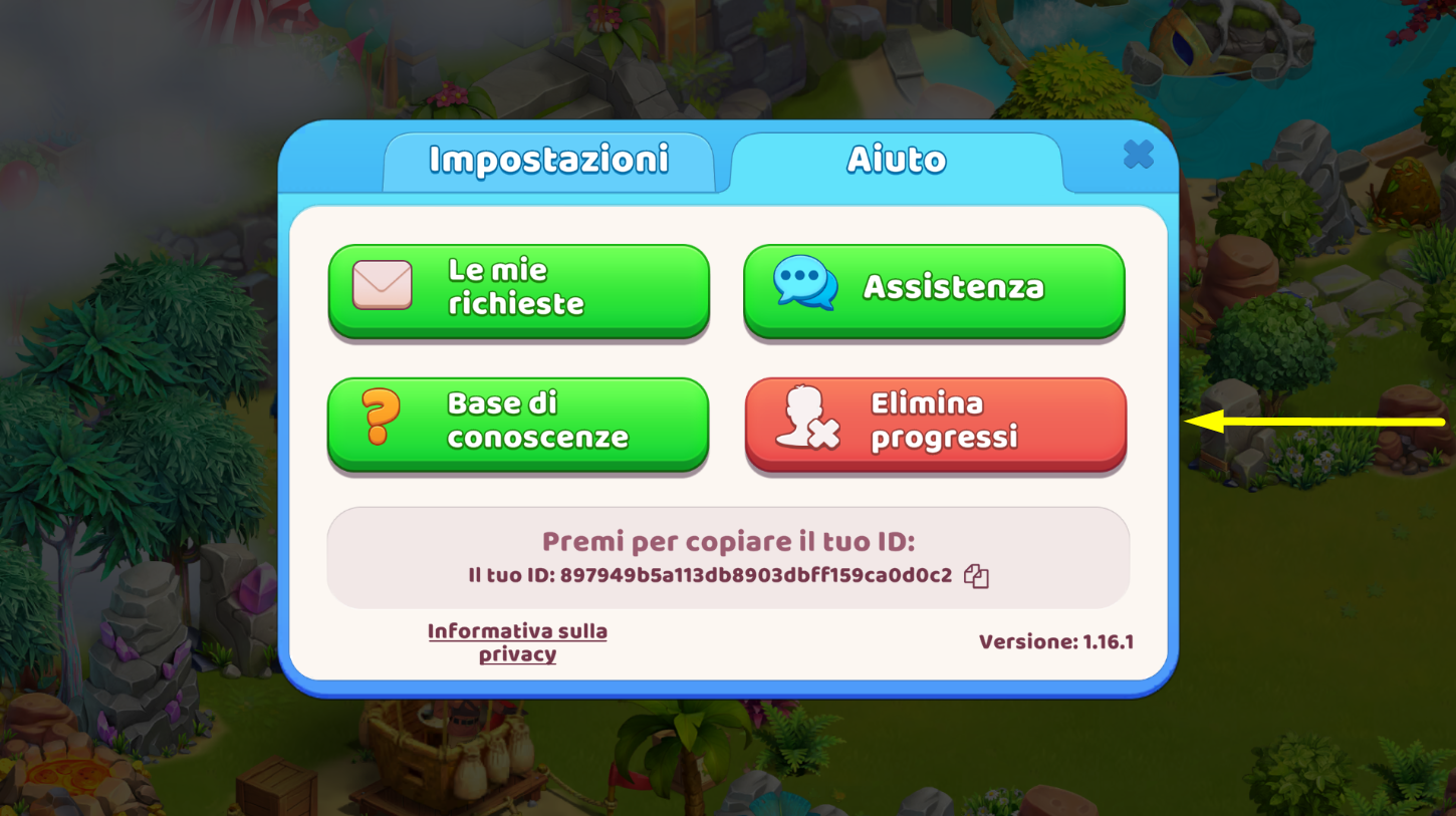 Per eliminare i progressi e ricominciare il gioco dall'inizio, apri la scheda Aiuto nel menu del gioco e premi il pulsante Elimina progressi. Apparirà una finestra di conferma in cui dovrai inserire un codice. Dopo aver confermato l'eliminazione inserendo le cifre richieste, verranno cancellati i progressi attuali, tutti gli acquisti effettuati e le risorse raccolte.