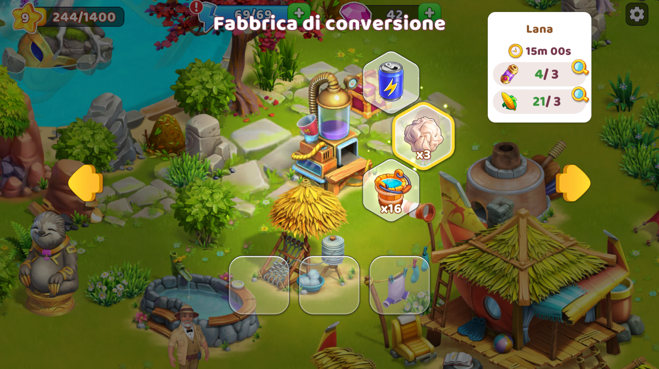Per ottenere la lana, nutri le pecore e sintetizzala nella Fabbrica di conversione. Per farlo, ti servono mais e Convertarium. Puoi ottenerli conquistando i primi posti nelle ambientazioni temporanee.