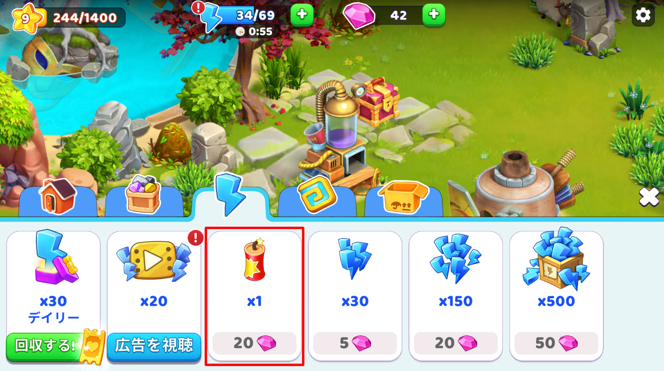 「ダイナマイト」を使用することで一瞬で資源を集めることができます。集めたい資源の近くに「ダイナマイト」を設置してください。起爆すると、爆発の範囲内にあった資源が、倉庫へと運ばれます。