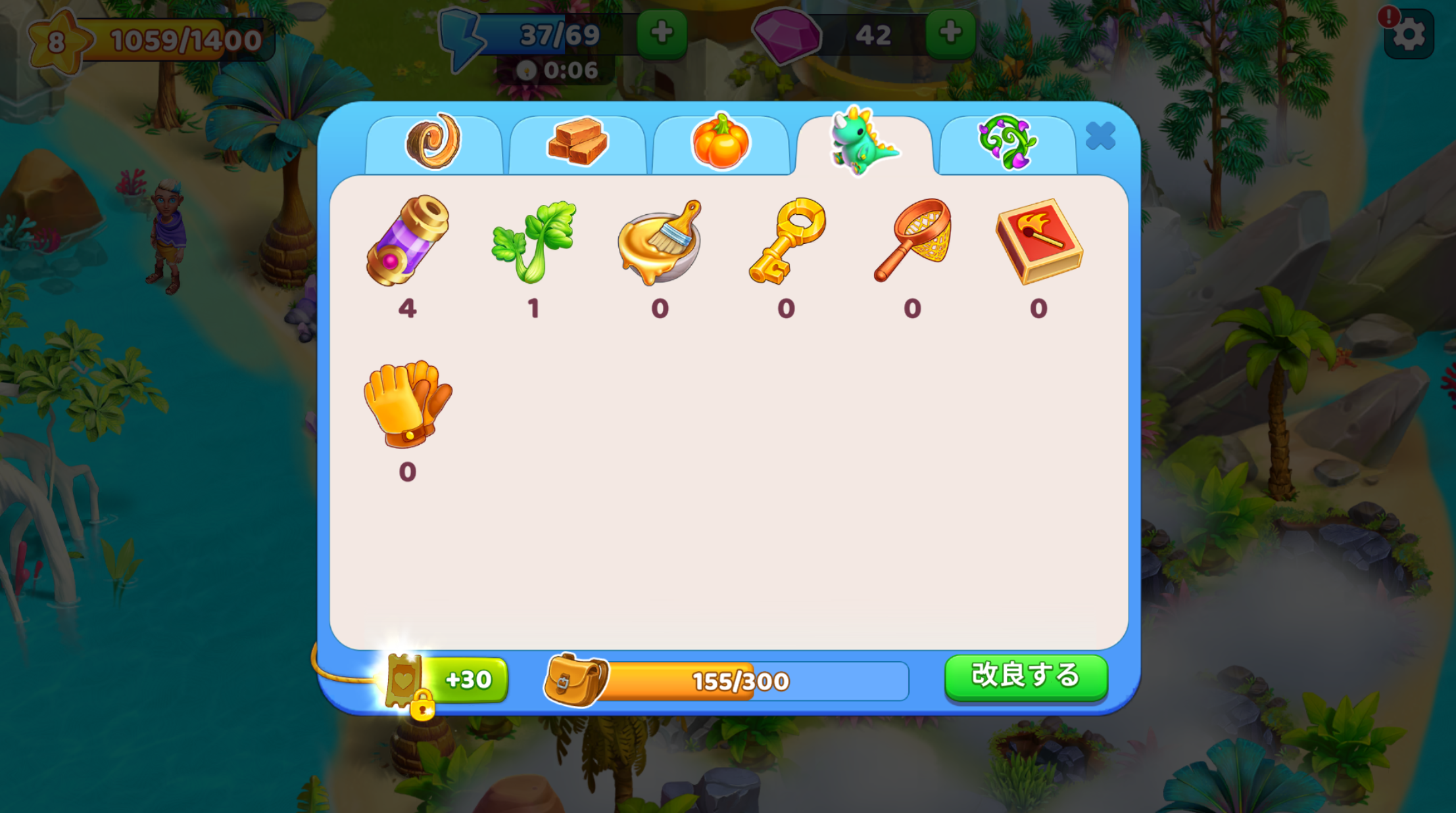 倉庫にはいくつかの項目があります。資源の項目、生産アイテム、自然の生産物、栽培した作物、そして常設ロケーションのアイテムの項目(恐竜マークのタブ)もあります。常設ロケーションのアイテムは、倉庫のスペースを圧迫しません。