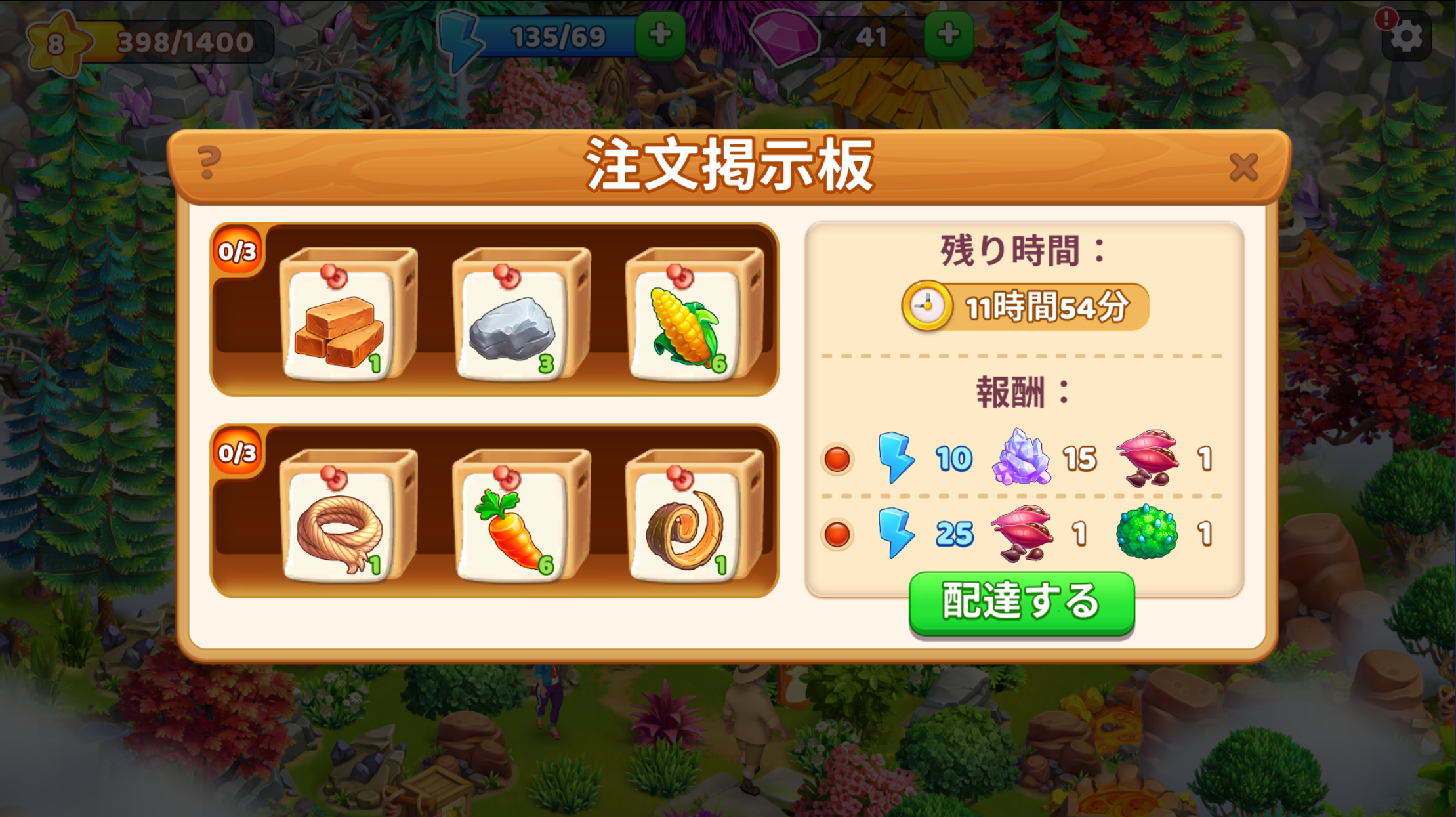 「注文掲示板」は「本島」の右側に設置されていますが、設置場所を変更したい場合は、「本島」の空いている場所に、他の建設物と同じ方法で移動できます。「注文掲示板」を使用することで様々なアイテムをエネルギーと交換したり、「苔」、「黒曜石」、「種」、「細糸」などのここでしか手に入らないアイテムを調達できます。これらのアイテムは掲示板に掲載された6つの注文すべてを埋め、「配達する」ボタンを押すとすぐに獲得できます。