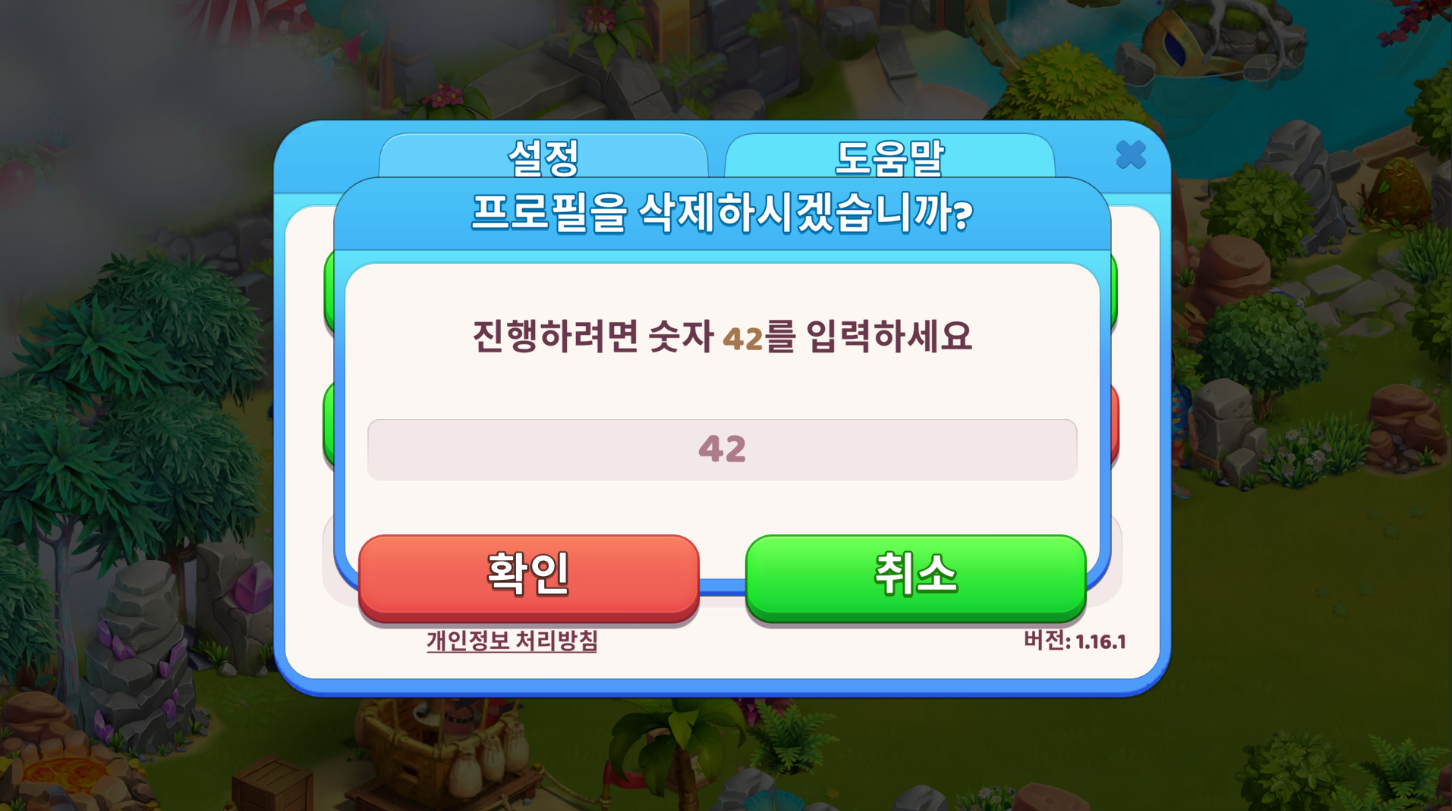 진행 상황을 삭제하고 게임을 다시 시작하려면 게임 내 메뉴에서 도움말 탭을 선택한 후 진행 상황 삭제 버튼을 눌러야 합니다. 그러면 코드 입력란이 있는 확인 창이 나타납니다. 필요한 코드를 입력해 삭제를 확인하면 현재 진행 상황과 함께 지금까지의 모든 구매 내역, 수집 자원이 삭제됩니다.