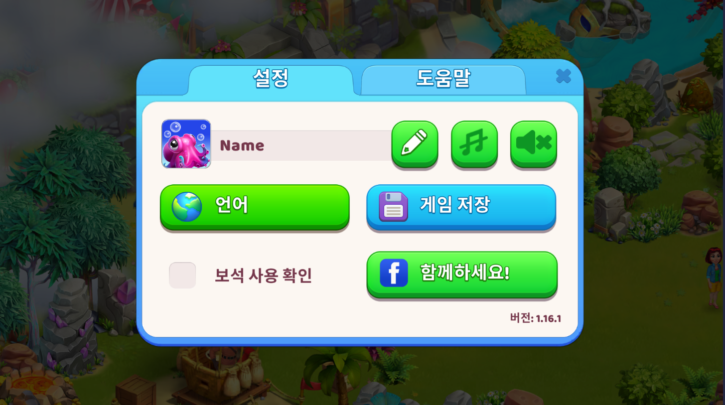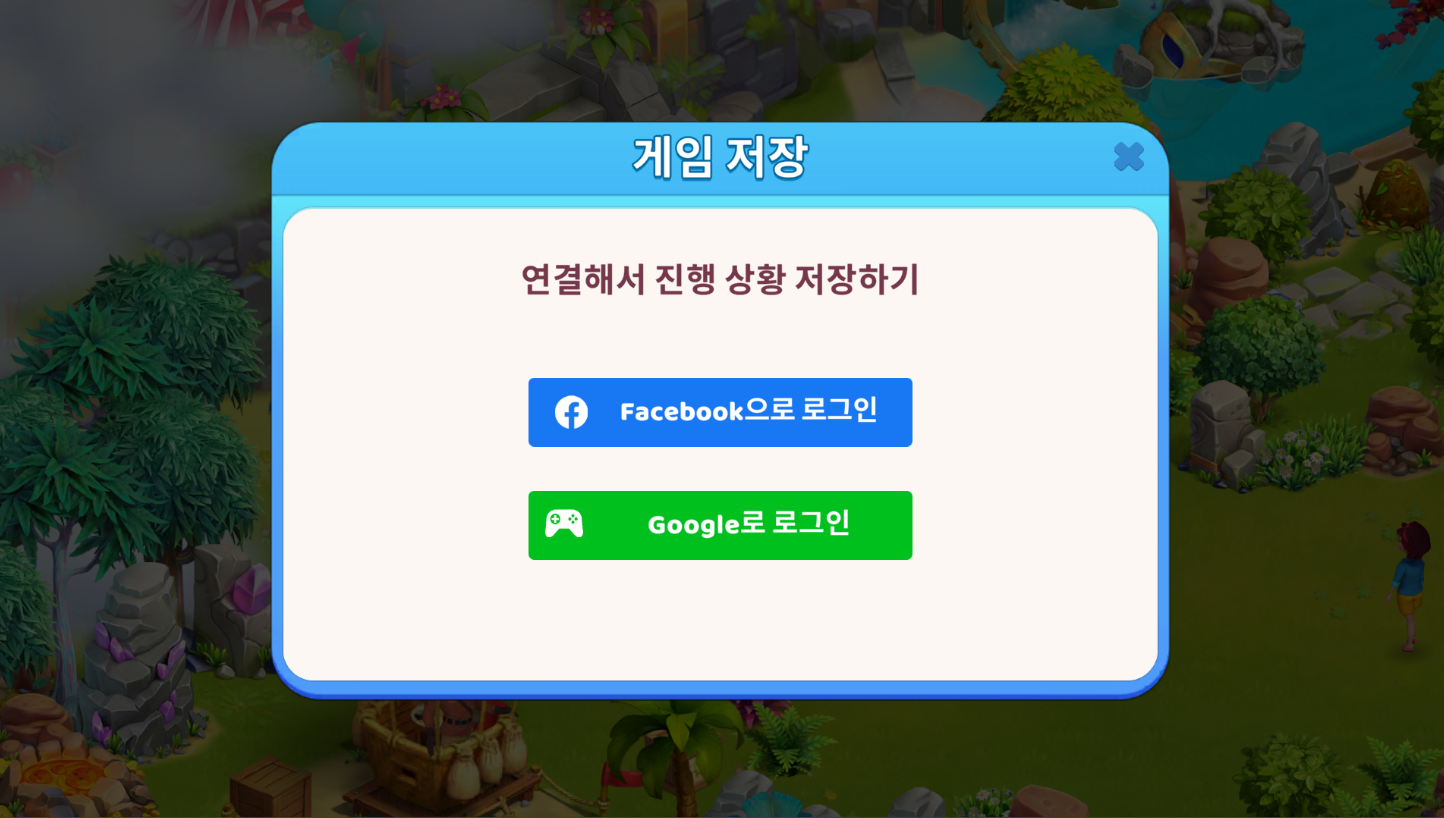 게임 진행 상황은 Facebook/Google Play/Apple ID를 사용해 저장합니다. 게임 메뉴에서 가능한 옵션을 확인할 수 있습니다. 화면 오른쪽 상단에서 버튼을 누르고 메뉴에서 "진행 상황 저장하기" 버튼을 누르면 저장 옵션이 표시된 창이 열립니다.