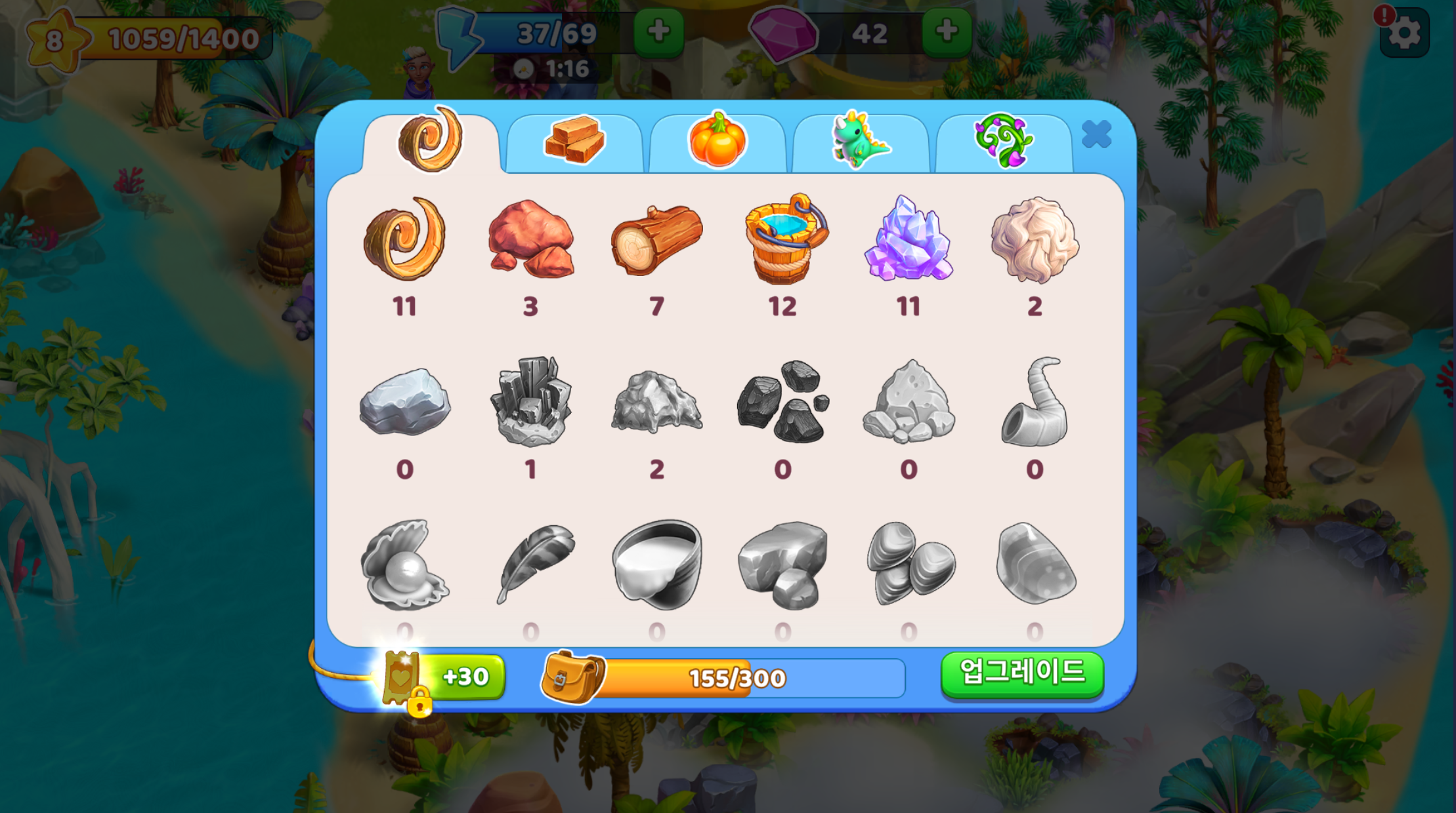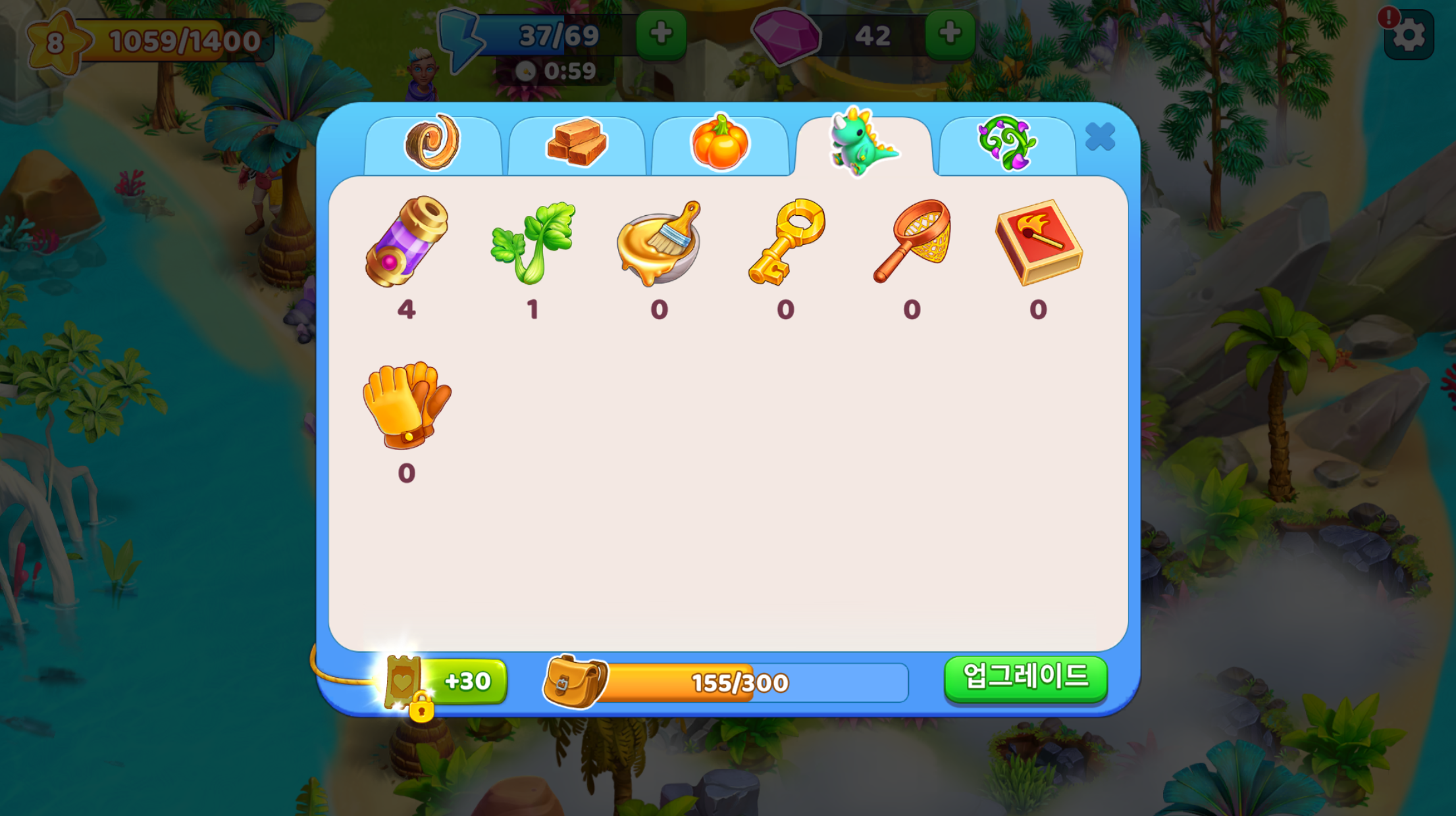 보관 아이템은 자원, 생산 아이템, 유기농 제품, 다 자란 작물 등 여러 섹션으로 나뉩니다. 공룡이 있는 탭은 상시 장소 아이템이 있는 섹션입니다. 상시 장소 아이템은 배낭에서 자리를 차지하지 않습니다.