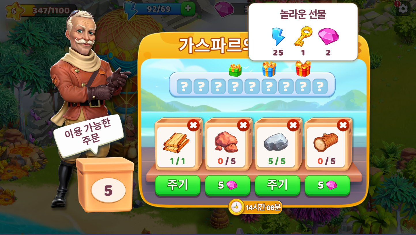 다섯 번째 레벨에 도달하고 화면 왼쪽에 표시된 활성 퀘스트를 완료하면 상인 가스파르가 홈 아일랜드로 날아오기 시작합니다. 가스파르의 열기구는 홈 아일랜드 서쪽에 있는 특별한 장소에 착륙합니다. 가스파르의 주문을 채우면 자원과 기력을 얻을 수 있으며 주문의 세 번째 단계에서는 상자를 여는 데 필요한 열쇠와 보석을 얻습니다.
