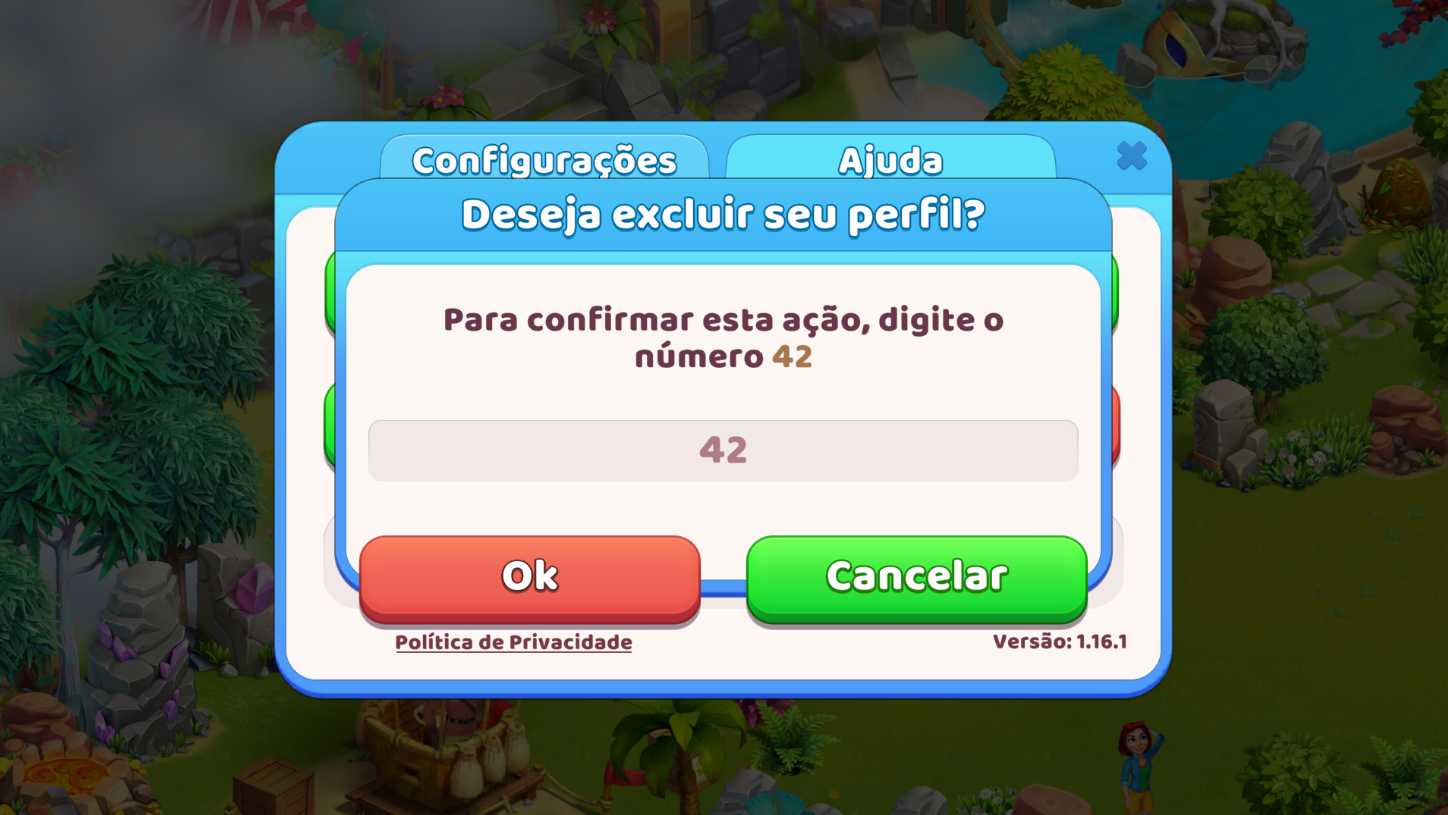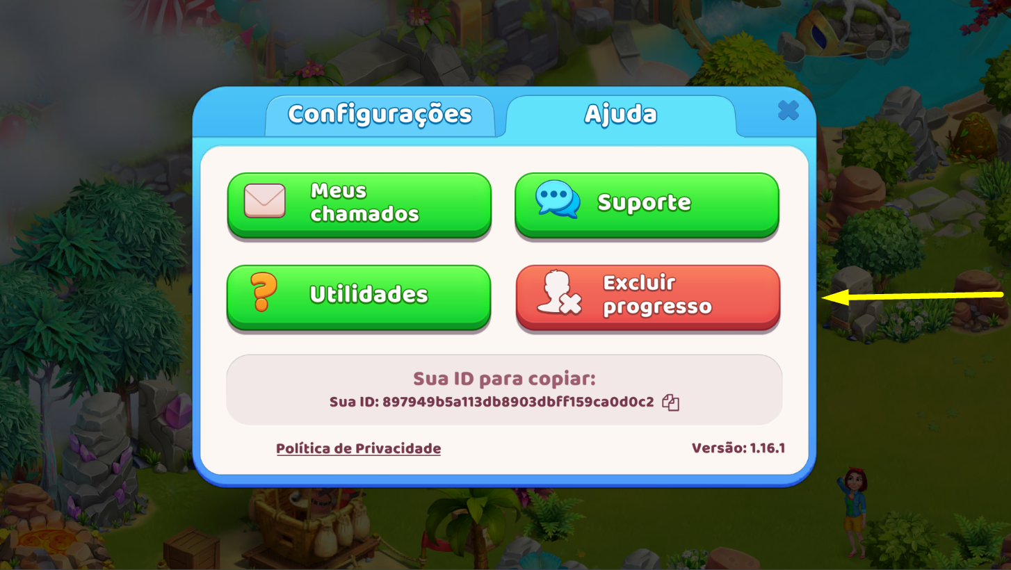 Para excluir seu progresso e começar o jogo novamente, basta escolher a aba Ajuda no menu do jogo e, em seguida, apertar o botão “Excluir progresso”. Uma janela de confirmação será exibida com um campo para inserir um código. Após inserir as figuras necessárias para confirmar a exclusão, seu progresso atual, bem como as compras realizadas e recursos coletados, será excluído.