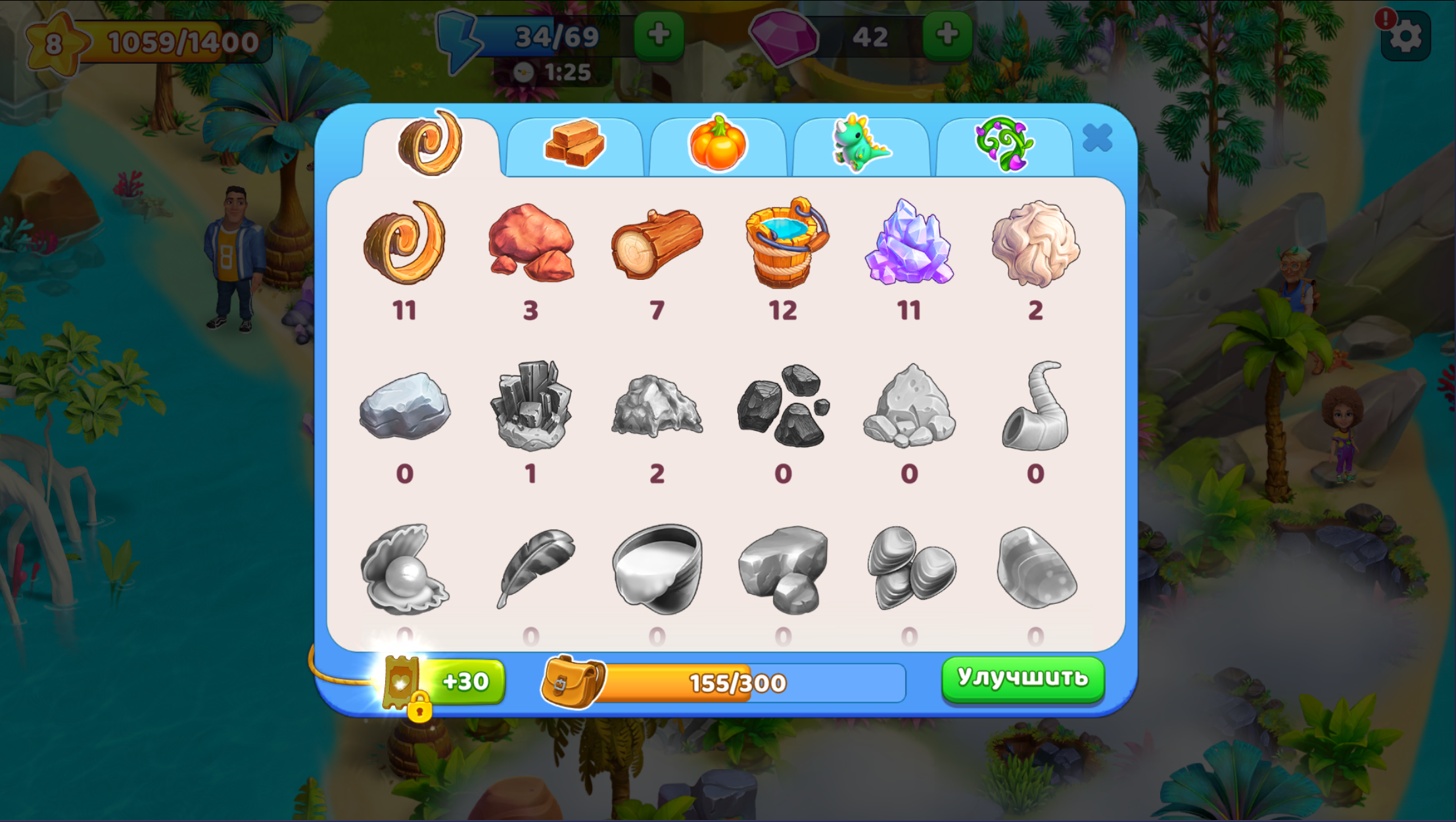 В вашем хранилище есть несколько разделов: раздел с ресурсами, предметами производства, органической продукцией и выращенными культурами, а также раздел с предметами временных локаций — вкладка с динозавром (данные предметы не занимают место в вашем хранилище).