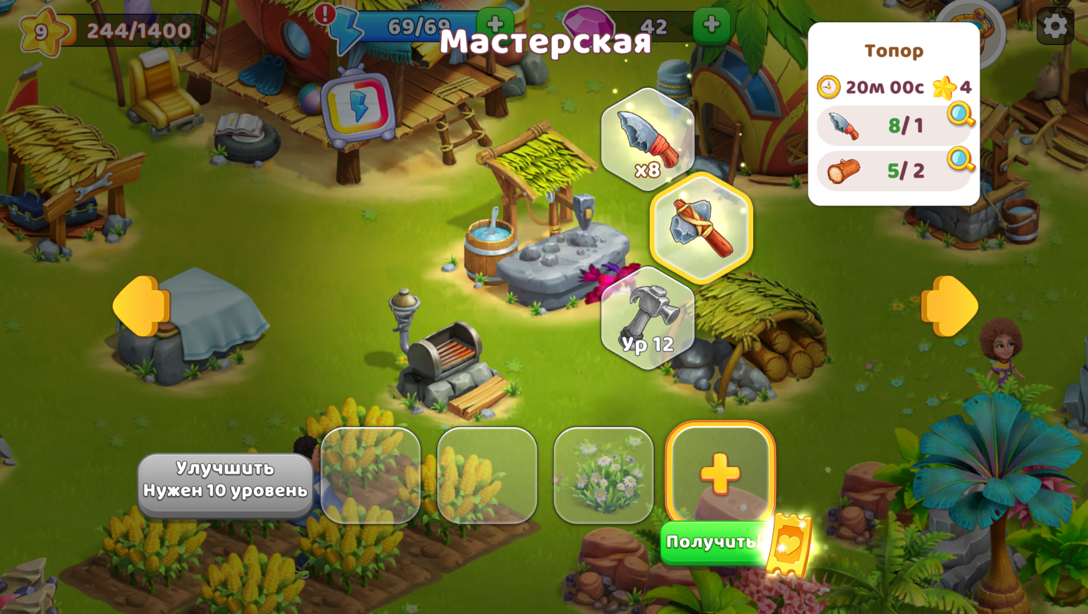 Изготовить каменный топор можно в Мастерской на Домашнем острове. Кликните на постройку Мастерской и выберите топор для производства, перенеся его в пустую ячейку внизу экрана.